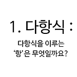 고등학교 수학의 첫 번째 단원은 다항식이죠. '다항식'이란 무엇일까요? 다항식의 한자 표기는 '多項式'에요. 첫 번째 한자인 '다(多)'는 '많다'라는 뜻을 가지고 있어요. 두 번째 한자인 '항(項)'은 항목을 나타낼 때 쓰이고 있어요. 마지막으로 '식(式)'은 공식, 함수식, 방정식, 부등식과 같이 수학적 관계를 나타낸 것이에요. 종합해보면, 다항식의 뜻은 '항이 많은 식'이 됩니다. (참고로 네이버 사전에서 '식(式)'을 찾아 보면 3번 뜻에 '숫자, 문자, 기호를 써서 이들 사이의 수학적 관계를 나타낸 것'이라고 되어 있어요.) 하지만 한자를 그대로 풀어서 생각한 '항이 많은 식'은 정확한 다항식의 정의가 아니에요. 다항식은 항들이 모여서 만들어진 식이지만 항이 항상 많은건 아니기 때문이에요. 그렇..